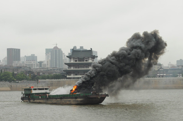 圖四 圖片說明 一、上午9時,一艘300噸的普通貨船從長沙鑫宇公司碼頭出發(fā)下行航行至湘江杜甫江閣下游花炮平臺水域時候,與一搜客渡船發(fā)生碰撞,客渡船2名乘客受傷,10人落水,船體進水失控,面臨沉沒危險。 二、這搜普通貨船在避讓落水人員時,又與經(jīng)過的另外一艘油船發(fā)生碰撞,致該船油艙破損,油船在自救過程中發(fā)生火災、爆炸,并出現(xiàn)柴油泄漏。 三、湖南省水上搜救中心接到報警后,組織水上搜救隊緊急行動,各部門全力配合。落水乘客最先全部獲救,傷者也被送往醫(yī)院。之后遇險船舶被拖往安全水域。 四、大約50分鐘后,油船大火被撲滅,溢油得到控制,油污被有效清除。 |