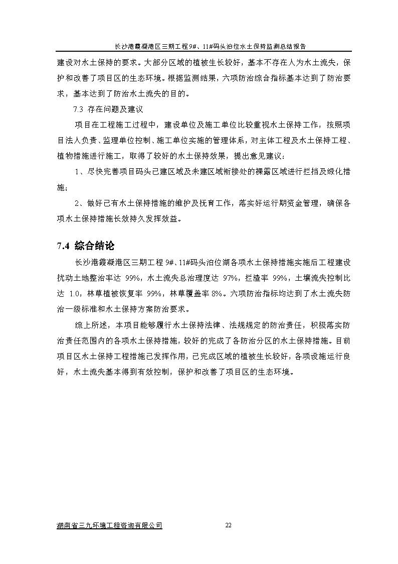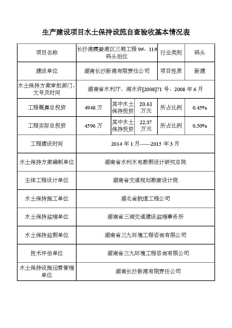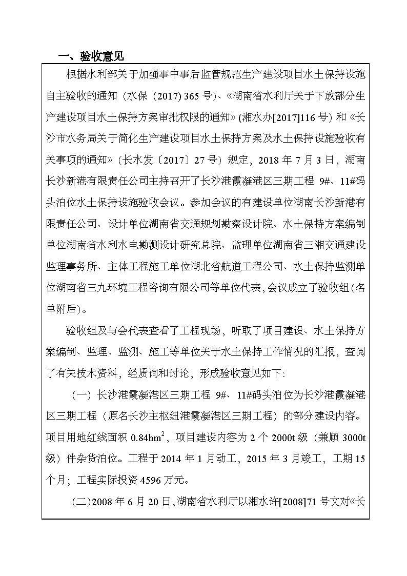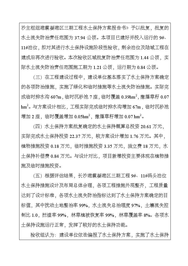 根據(jù)水利部關(guān)于加強事中事后監(jiān)管規(guī)范生產(chǎn)建設(shè)項目水土保持設(shè)施自主驗收的通知(水保(2017) 365號)、《湖南省水利廳關(guān)于下放部分生產(chǎn)建設(shè)項目水土保持方案審批權(quán)限的通知》(湘水辦[2017]116號)和《長沙市水務(wù)局關(guān)于簡化生產(chǎn)建設(shè)項目水土保持方案及水土保持設(shè)施驗收有關(guān)事項的通知》(長水發(fā)〔2017〕27號)規(guī)定,2018年7月3日,湖南長沙新港有限責任公司主持召開了長沙港霞凝港區(qū)三期工程9#、11#碼頭泊位水土保持設(shè)施驗收會議,會議成立了驗收組。 通過深入工程現(xiàn)場核查,并查閱相關(guān)檔案資料,驗收小組認為本工程積極落實了各施工區(qū)域的水土流失防治工作,水土保持設(shè)施質(zhì)量總體合格,水土流失防治指標達到了水土保持方案確定的目標值,符合水土保持設(shè)施竣工驗收的條件。驗收組一致同意長沙港霞凝港區(qū)三期工程9#、11#碼頭泊位水土保持設(shè)施通過驗收。經(jīng)驗收組與會議審議,形成了《長沙港霞凝港區(qū)三期工程9#、11#碼頭泊位水土保持設(shè)施自查驗收鑒定書》。