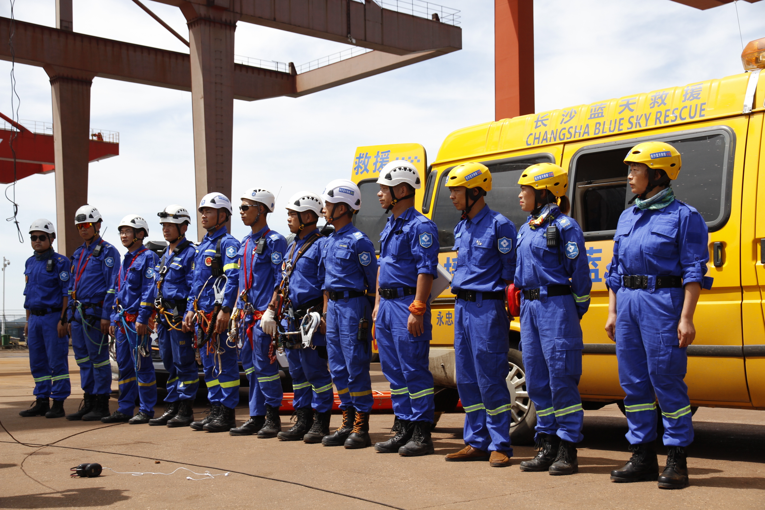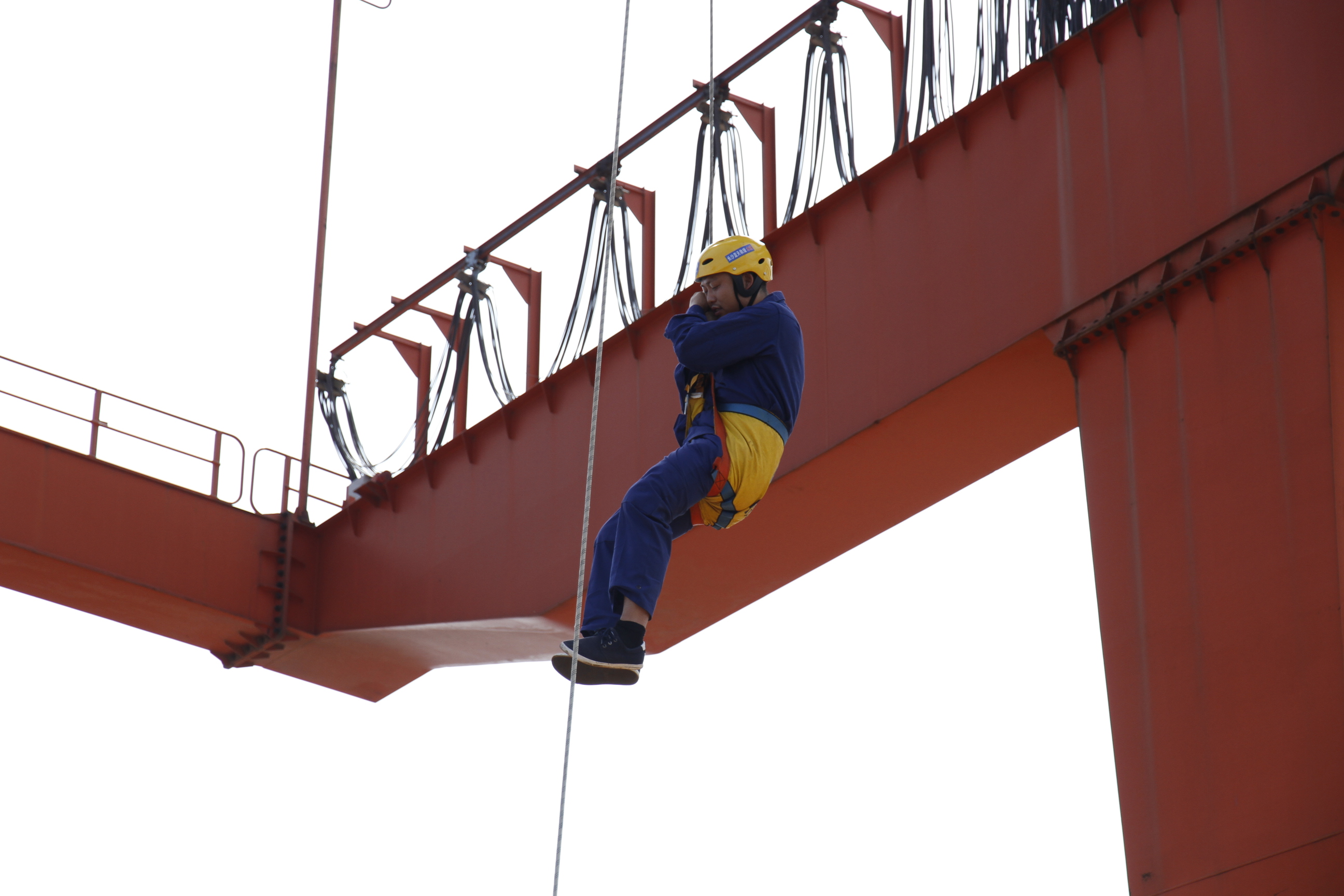 被困門吊司機(jī)被藍(lán)天救援隊利用索降方式從吊車順利救援下來。