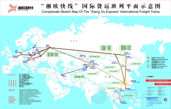 在長(zhǎng)沙鐵路貨運(yùn)新北站,來(lái)自湖南省內(nèi)及江西等省份的貨物集中于此,電子產(chǎn)品、鞋服等出口貨物裝上中歐班列(長(zhǎng)沙),不到20天就能抵達(dá)歐洲。圖為湘歐快線最新線路圖。