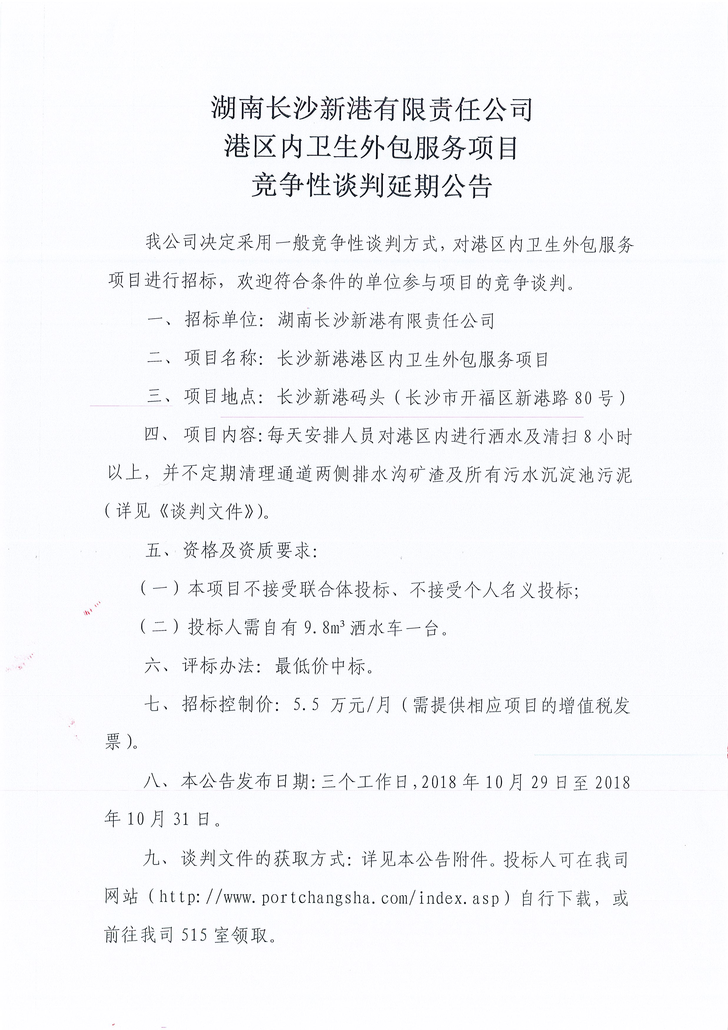 湖南長(zhǎng)沙新港有限責(zé)任公司港區(qū)內(nèi)衛(wèi)生外包服務(wù)項(xiàng)目競(jìng)爭(zhēng)性談判延期公告