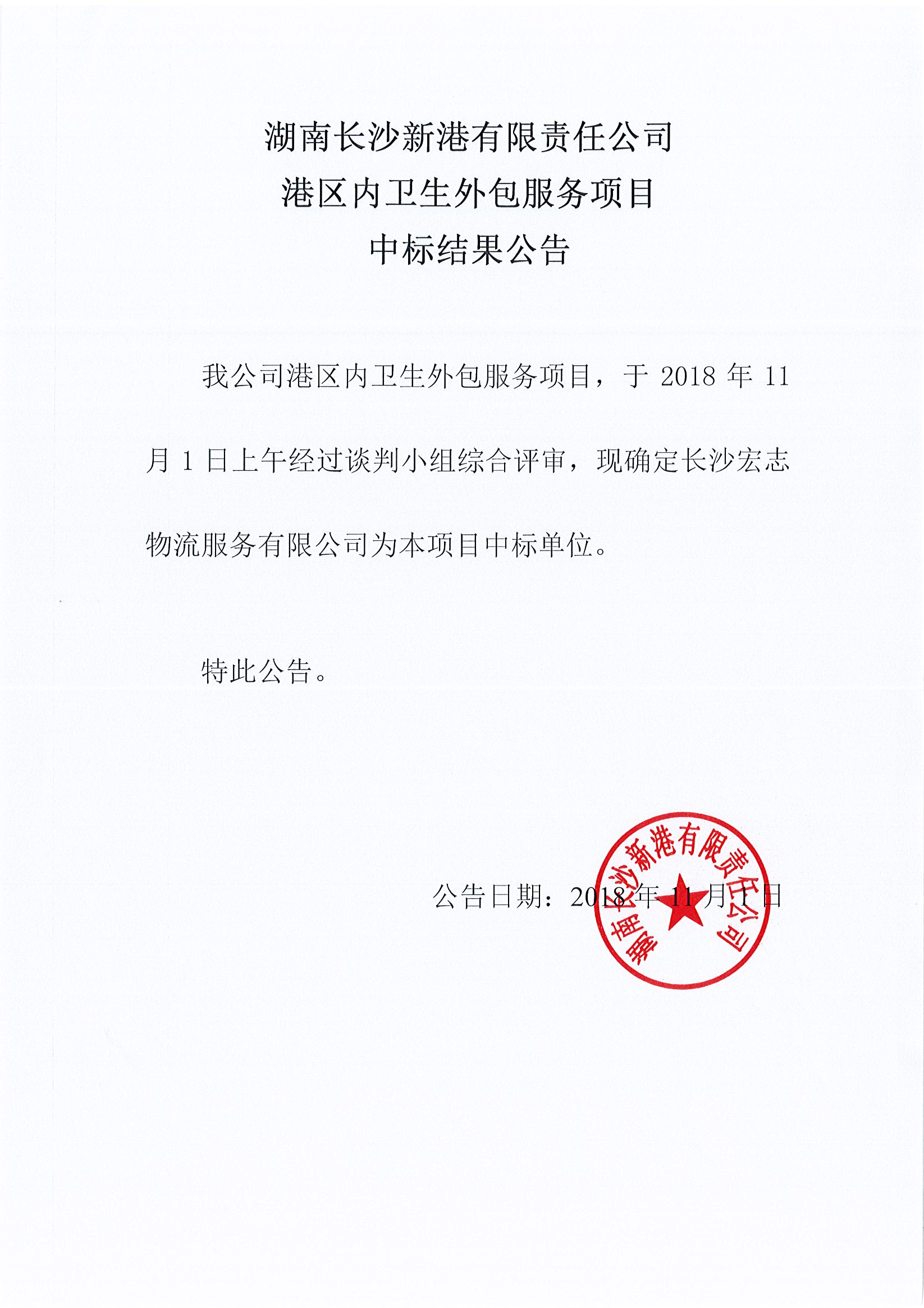 湖南長沙新港有限責任公司港區(qū)內衛(wèi)生外包服務項目中標結果公示