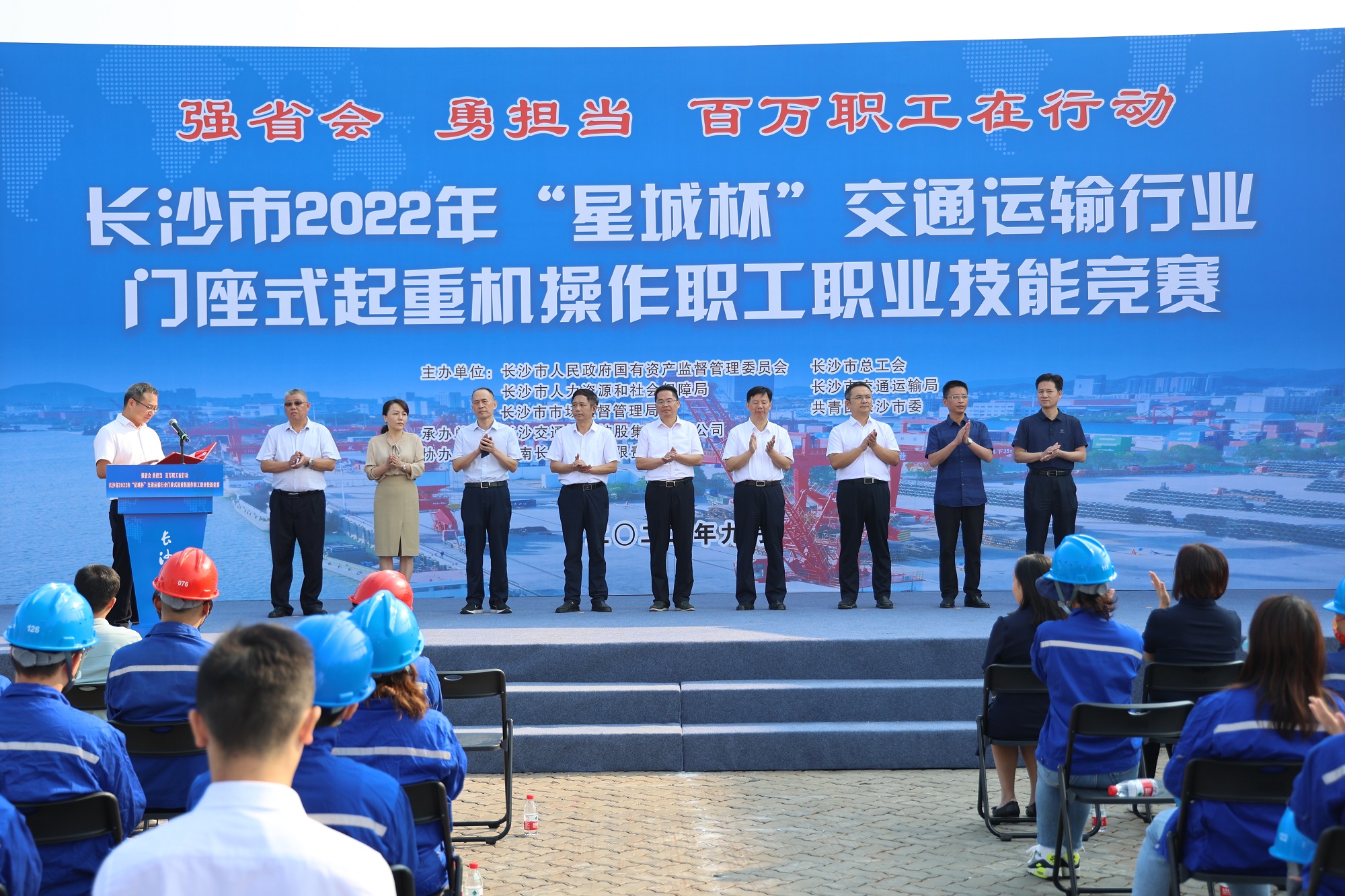 9月29日,“強(qiáng)省會(huì)、勇?lián)?dāng)、百萬(wàn)職工在行動(dòng)”長(zhǎng)沙市2022年“星城杯”交通運(yùn)輸行業(yè)門座式起重機(jī)操作職工職業(yè)技能競(jìng)賽在長(zhǎng)沙交通集團(tuán)長(zhǎng)沙新港公司開(kāi)幕。此次競(jìng)賽由長(zhǎng)沙市國(guó)資委、長(zhǎng)沙市總工會(huì)、長(zhǎng)沙市人力資源和社會(huì)保障局、長(zhǎng)沙市交通運(yùn)輸局、長(zhǎng)沙市市場(chǎng)監(jiān)督管理局、共青團(tuán)長(zhǎng)沙市委聯(lián)合舉辦,長(zhǎng)沙交通投資控股集團(tuán)有限公司承辦。競(jìng)賽組委會(huì)主任、市國(guó)資委黨委委員、工會(huì)工委主任、機(jī)關(guān)黨委書記錢軍出席開(kāi)幕式并致辭,長(zhǎng)沙市總工會(huì)黨組書記、副主席彭鑒西宣布比賽正式開(kāi)始。