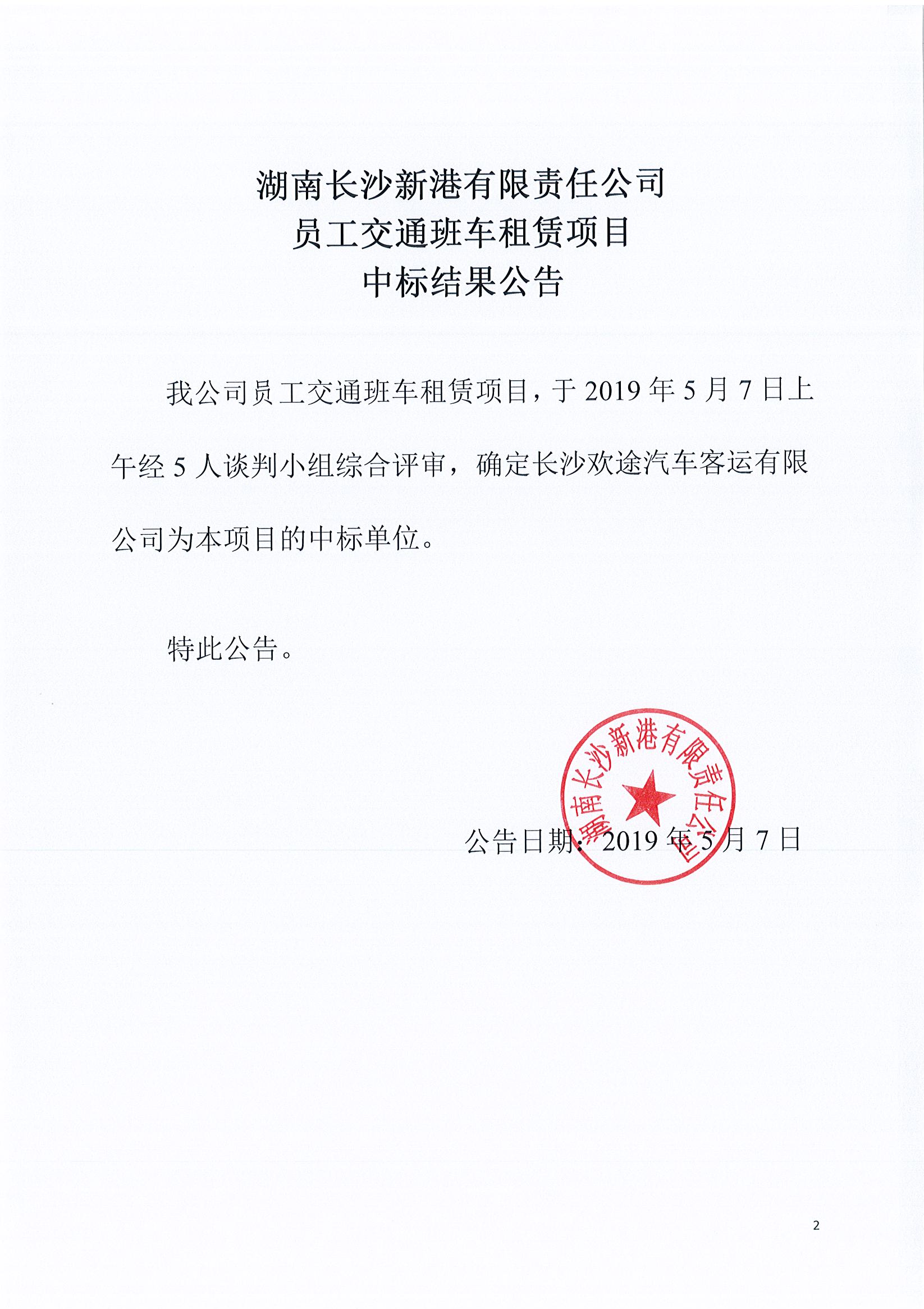 湖南長沙新港有限責(zé)任公司員工交通班車租賃項目中標(biāo)結(jié)果公告