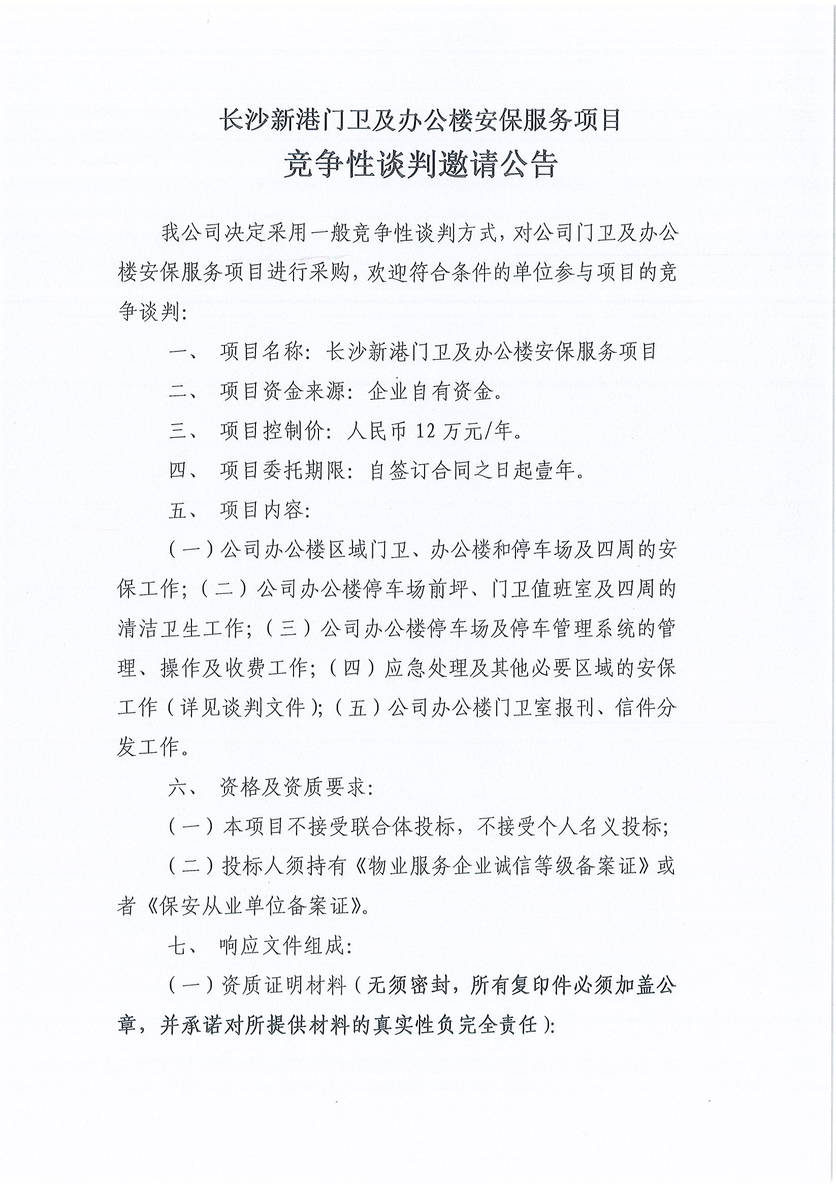 長沙新港門衛(wèi)及辦公樓安保服務(wù)項目競爭性談判邀請公告