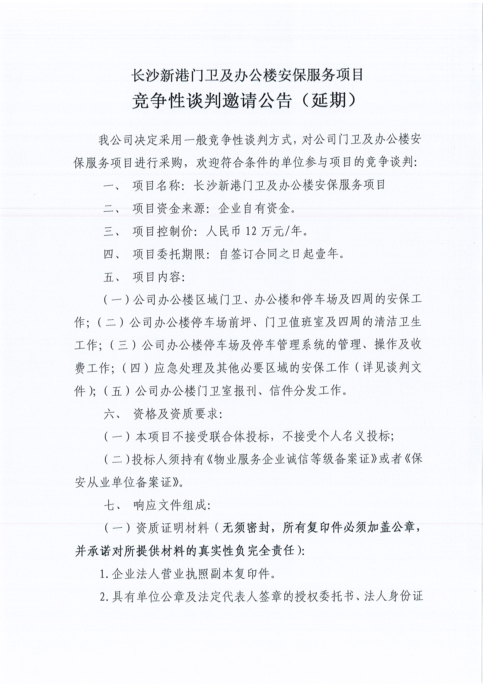 長(zhǎng)沙新港門衛(wèi)及辦公樓安保服務(wù)項(xiàng)目競(jìng)爭(zhēng)性談判邀請(qǐng)公告(延期)