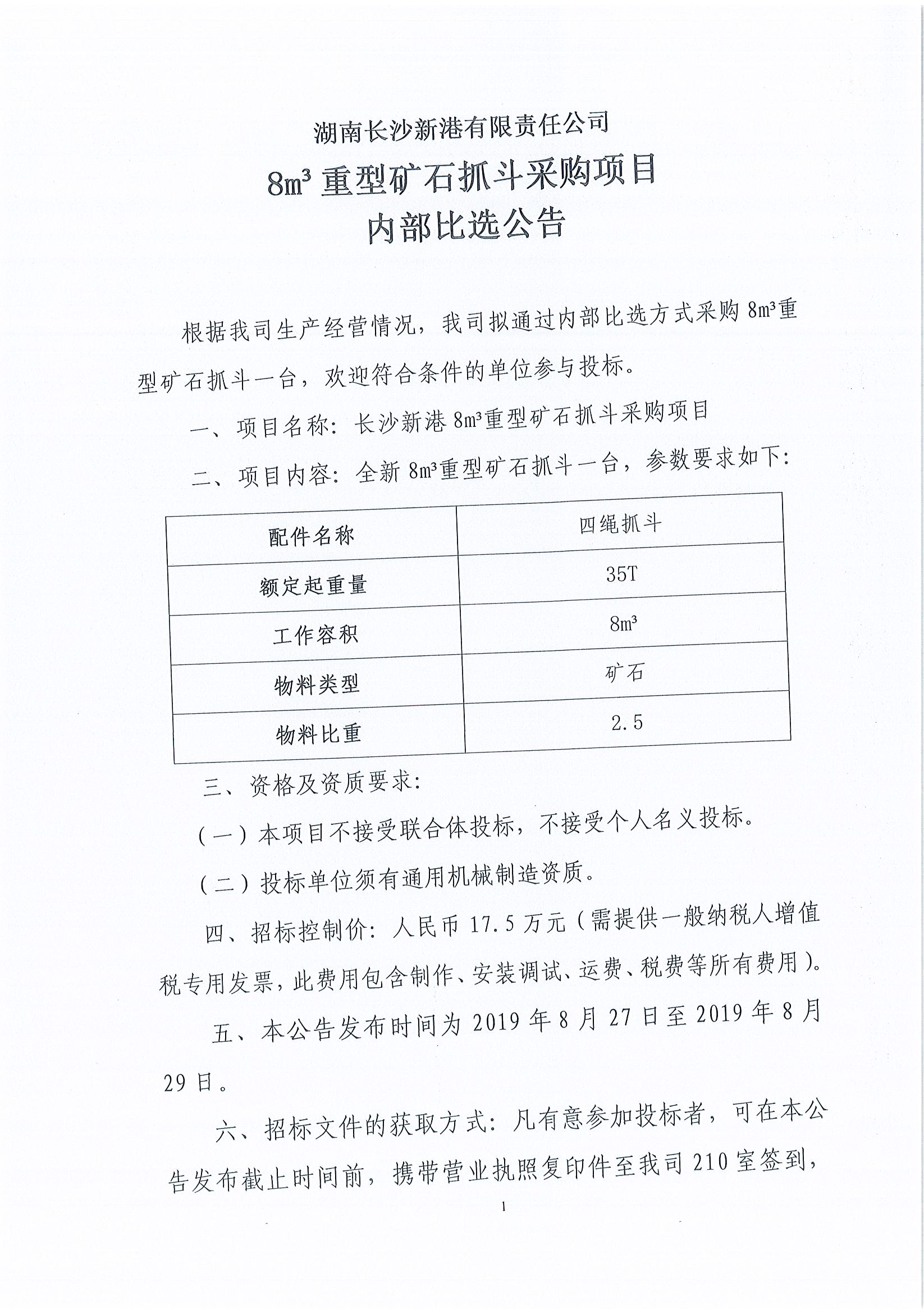 湖南長(zhǎng)沙新港有限責(zé)任公司8m³重型礦石抓斗采購(gòu)項(xiàng)目?jī)?nèi)部比選公告