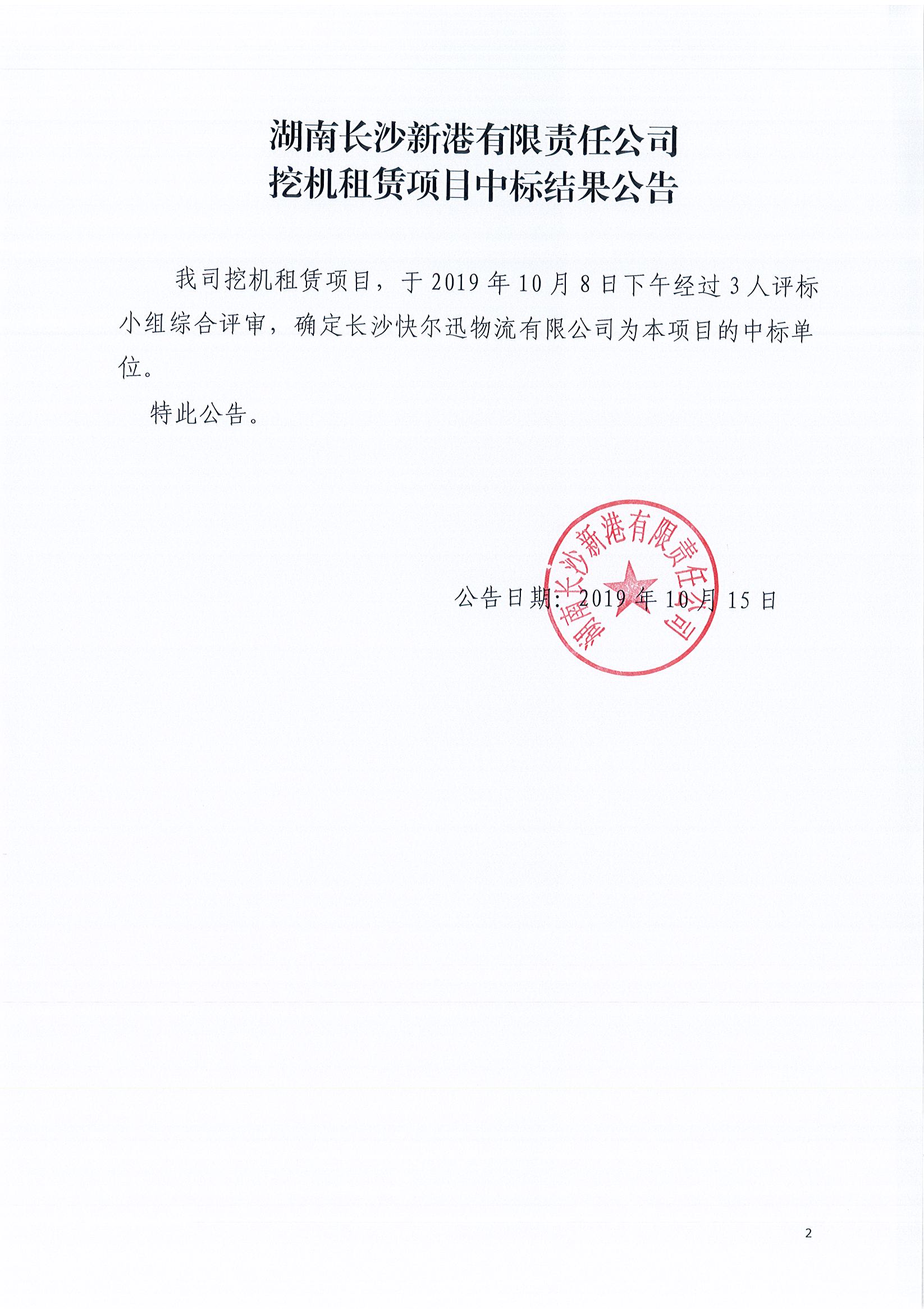 湖南長沙新港有限責(zé)任公司挖機(jī)租賃項(xiàng)目中標(biāo)結(jié)果公告