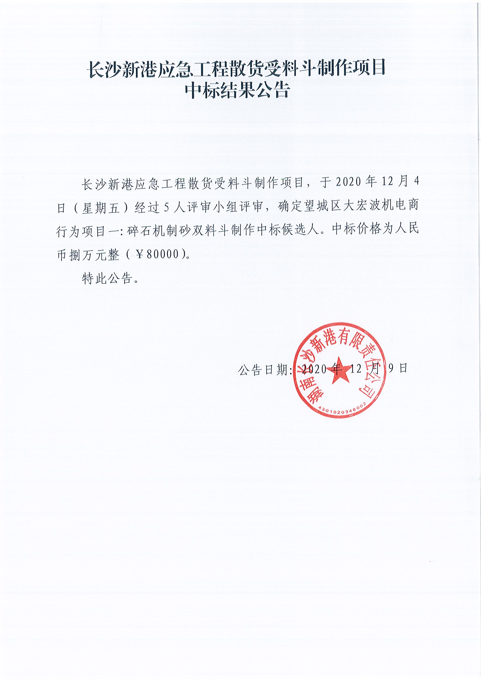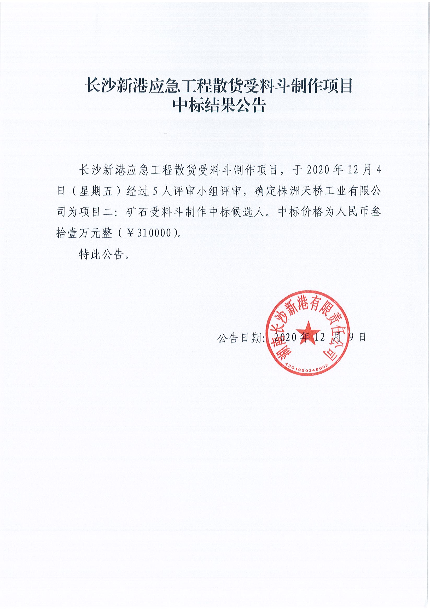 長沙新港應(yīng)急工程散貨受料斗制作項目中標結(jié)果公告