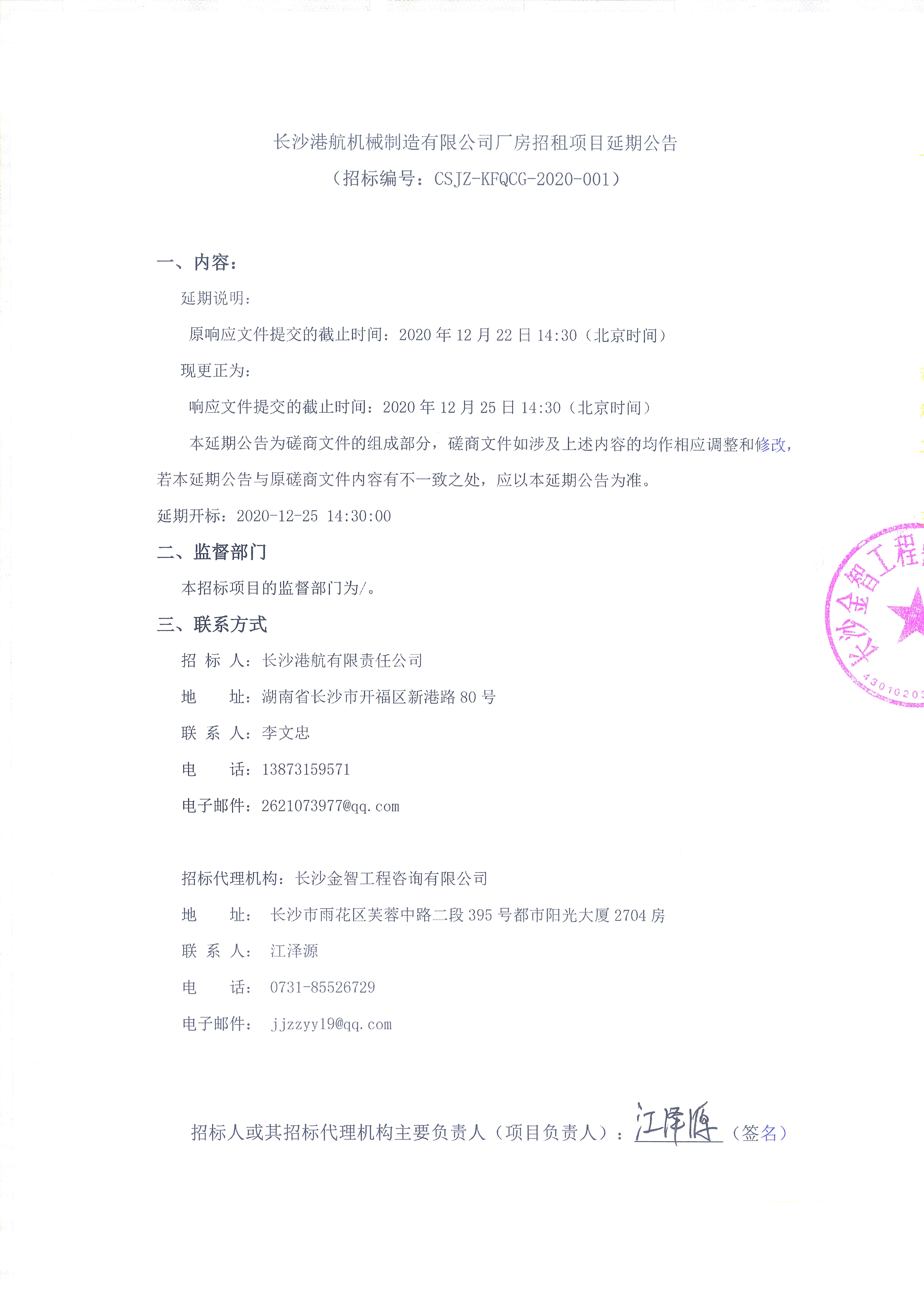 長沙港航機(jī)械制造有限公司廠房招租項(xiàng)目延期公告