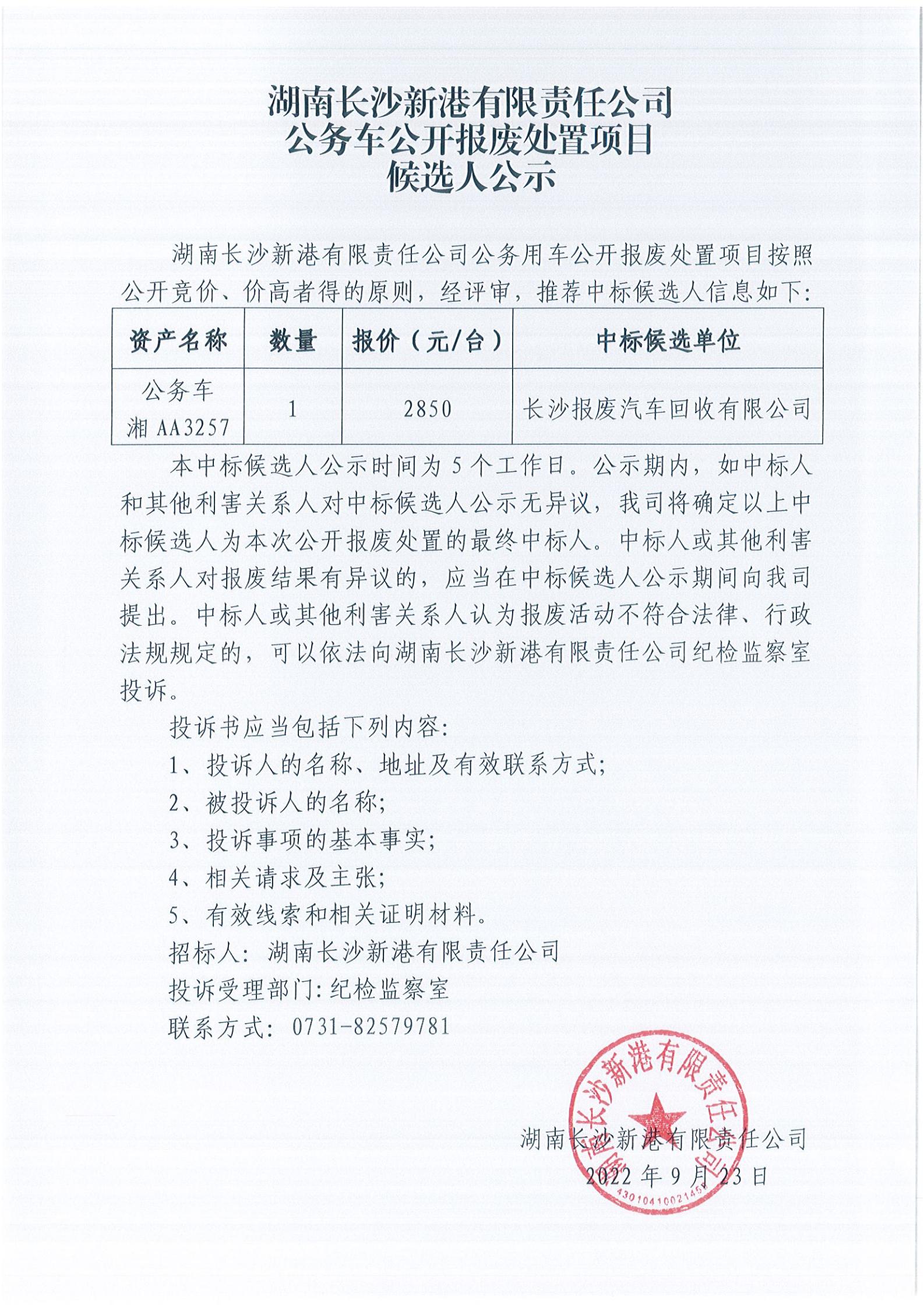 湖南長沙新港有限責(zé)任公司公務(wù)車公開報(bào)廢處置項(xiàng)目候選人公示