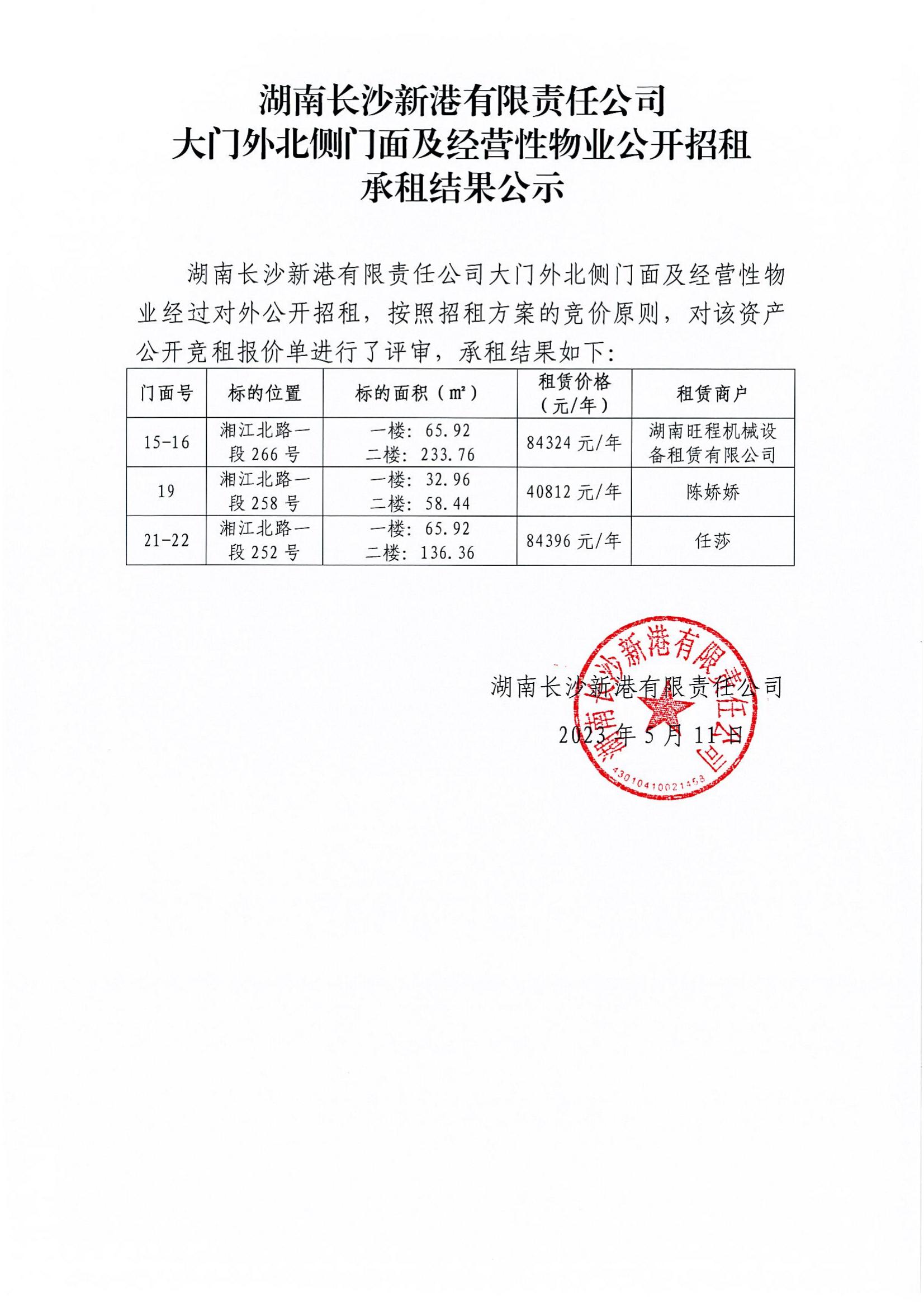 新港公司大門外北側(cè)門面及經(jīng)營(yíng)性物業(yè)公開招租承租結(jié)果公示