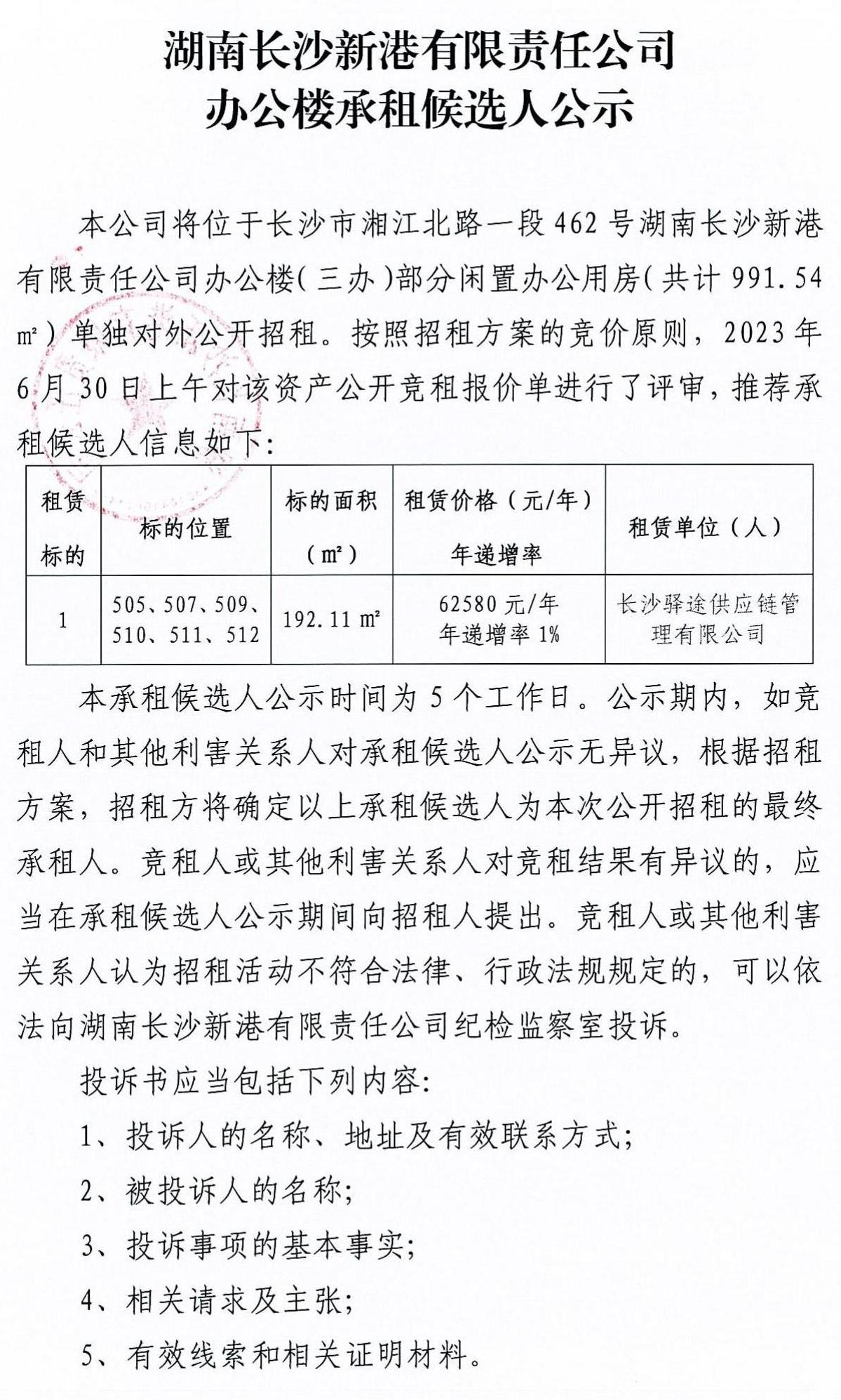 湖南長沙新港有限責任公司辦公樓承租候選人公示