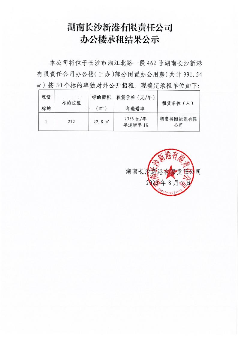 湖南長沙新港有限責任公司辦公樓承租結果公示