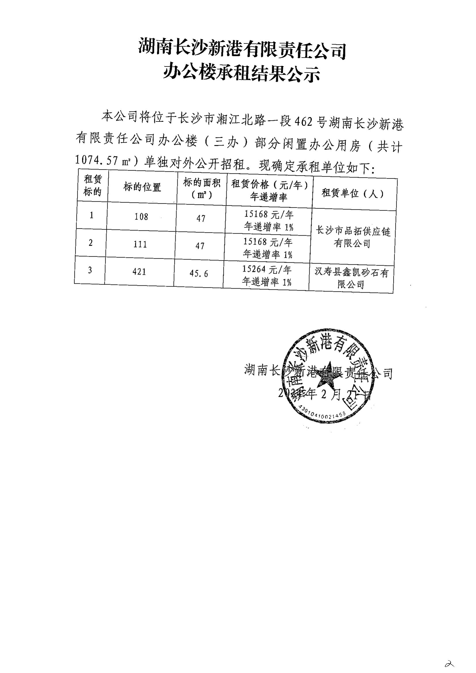 長(zhǎng)沙新港辦公樓承租結(jié)果公示(108/111/421)
