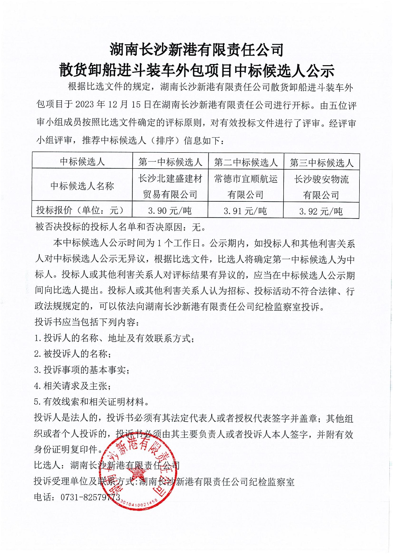長沙新港散貨卸船進斗裝車外包項目中標候選人公示