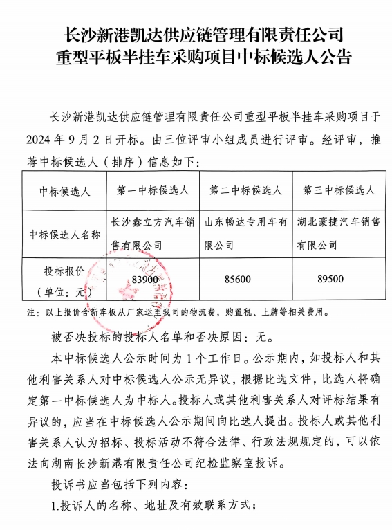 長(zhǎng)沙新港凱達(dá)供應(yīng)鏈管理有限責(zé)任公司重型平板半掛車采購(gòu)項(xiàng)目中標(biāo)候選人公告
