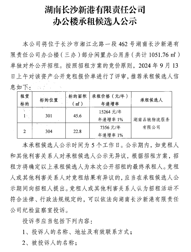 湖南長沙新港有限責(zé)任公司辦公樓承租候選人公示