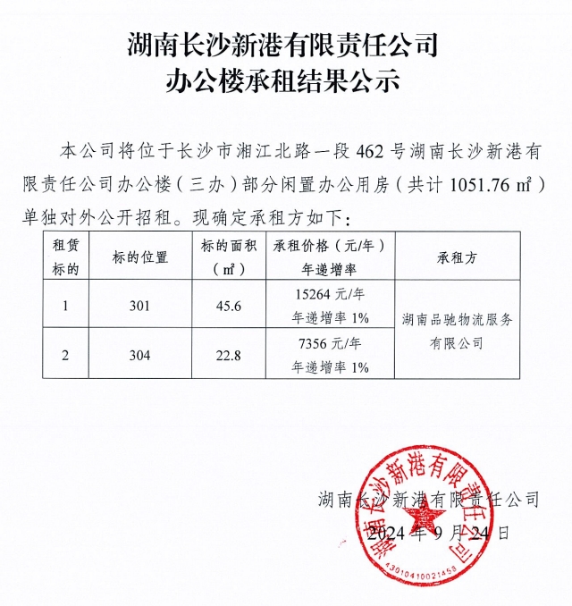 湖南長沙新港有限責(zé)任公司辦公樓承租結(jié)果公示